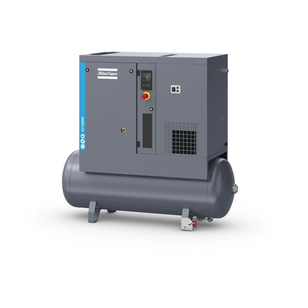 Speed-controlled, oil-injected, sound-dampened screw compressor of the Atlas Copco G series with compressed air receiver and integrated refrigerant dryer.