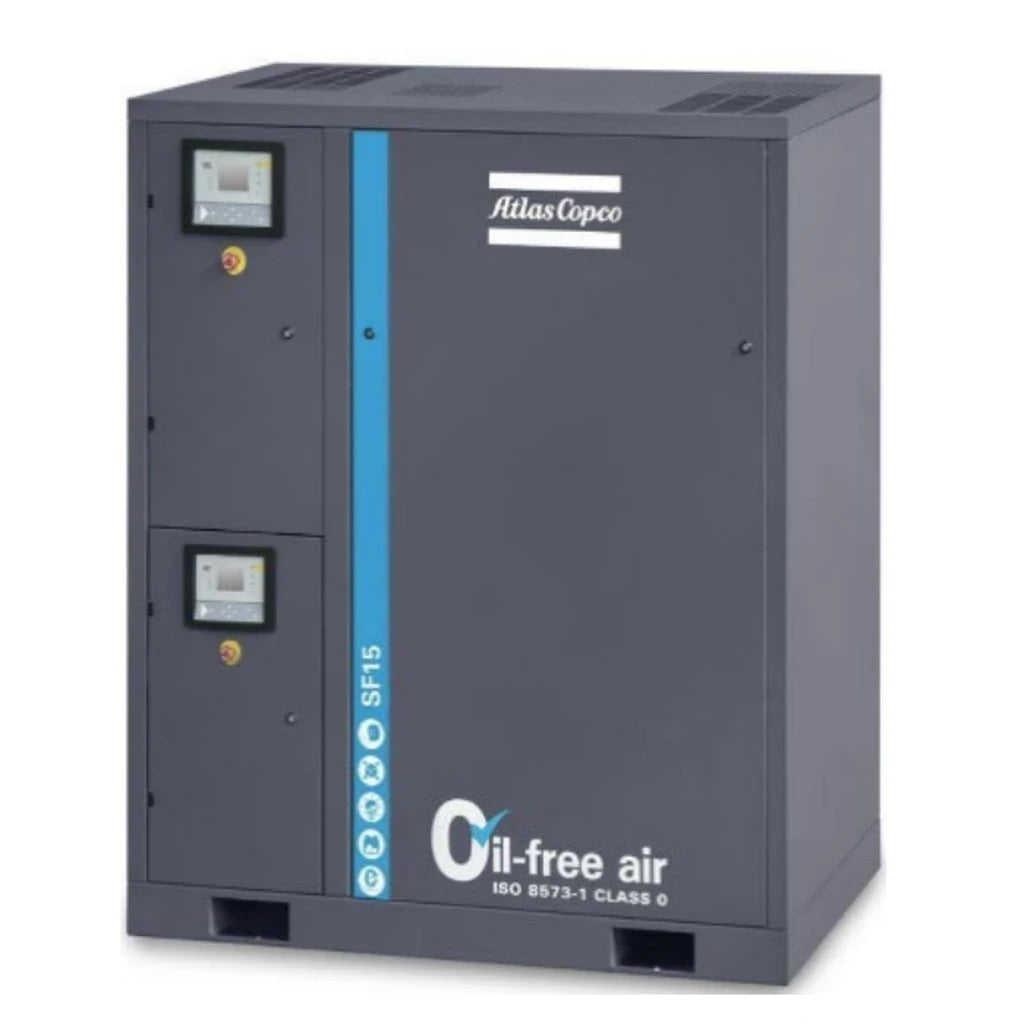 Oil-free scroll compressor as a duplex system according to ISO 8573-1 Class 0 with two control cabinets and central Elektronikon control system.